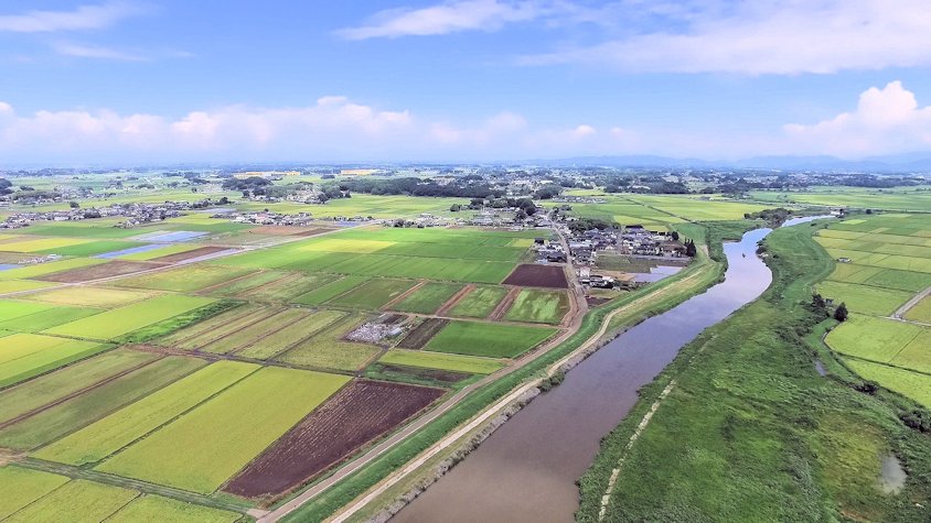左に筑波山が見えます。下を流れる川は桜川です。方向は上がほぼ南です。